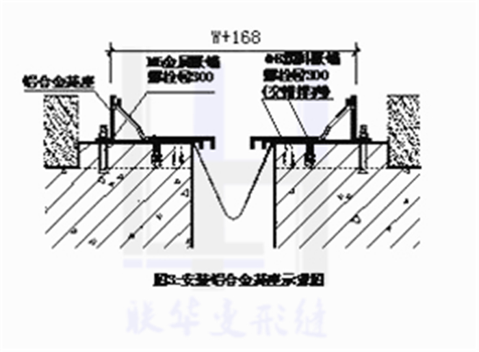 1、槽口预留处理成如图1所示形状、尺寸。处理深度检验方法:处理后,在安装基面上摆上铝合金基座,使铝合金基座上平面比地坪完成面低2mm为合适。图中W为伸缩缝缝宽。